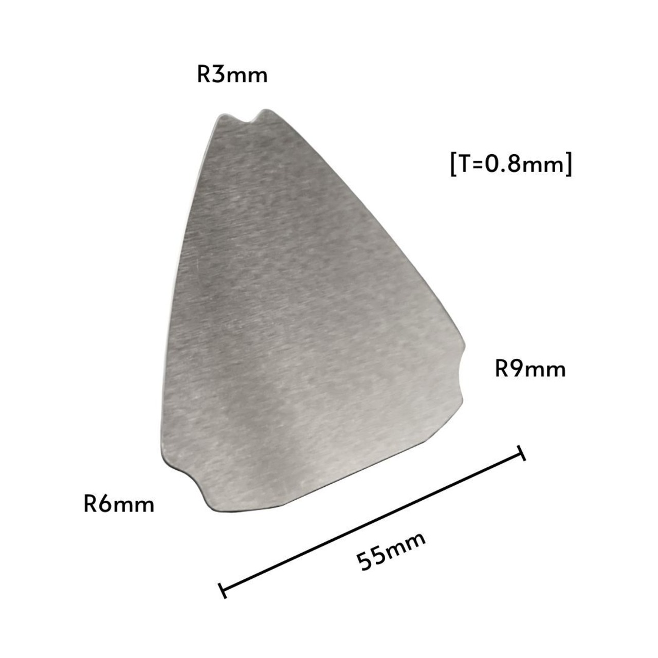 木工作品に欠かせない角のアールを仕上げるためのスクレーパー。3つの角はそれぞれR3、R6、R9mmで、市販の電動トリマーの中でも使用頻度の高いヘッドサイズに合わせた形状になっています。その他、棒状のものや薄い板状の端面を仕上げるのにもぴったり。