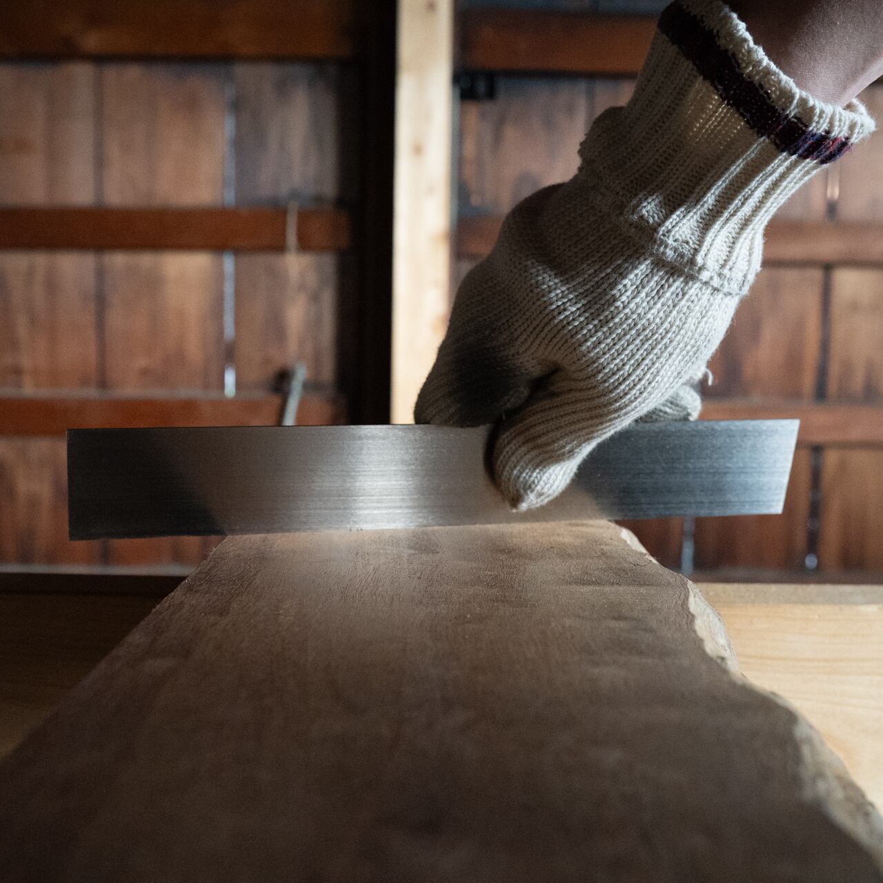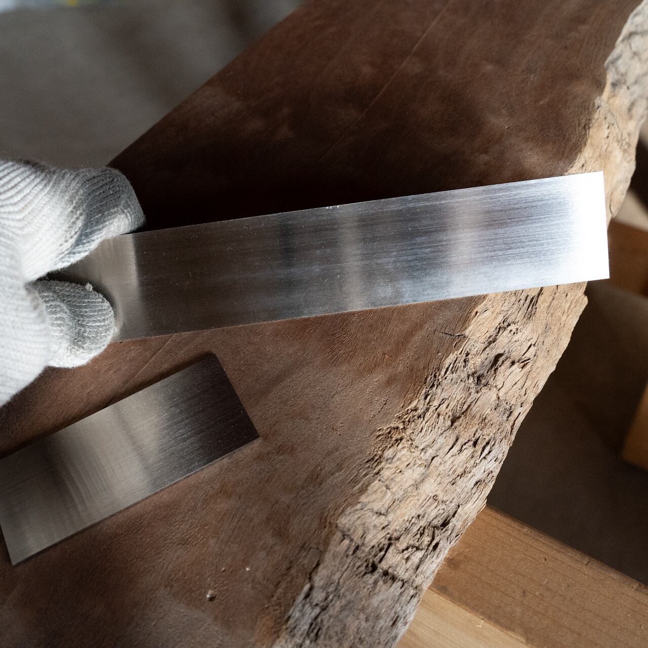 手焼き入れ特有の高い硬度で、広くフラットな面が均一に削れるので、非常に効率的に作業ができます。スクエアM同様に、長辺、短辺ともに刃が付けられているため、用途に合わせて使い分けが可能。椅子、ベンチ、テーブルなど家具を作る方には必須の逸品です。